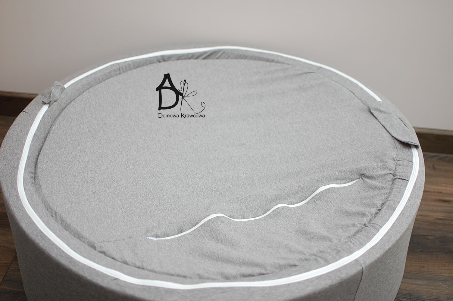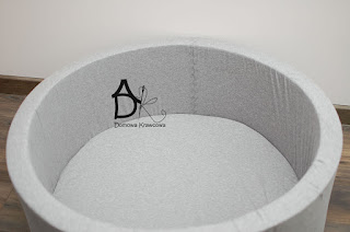 Zszywamy ze sobą boki ścianki suchego basenu powstał nam taki rękaw. Wycinamy z dzianiny pasek szerokości 3 cm i długości boku basenu, potrzebny nam będzie do przyszycia zamka.