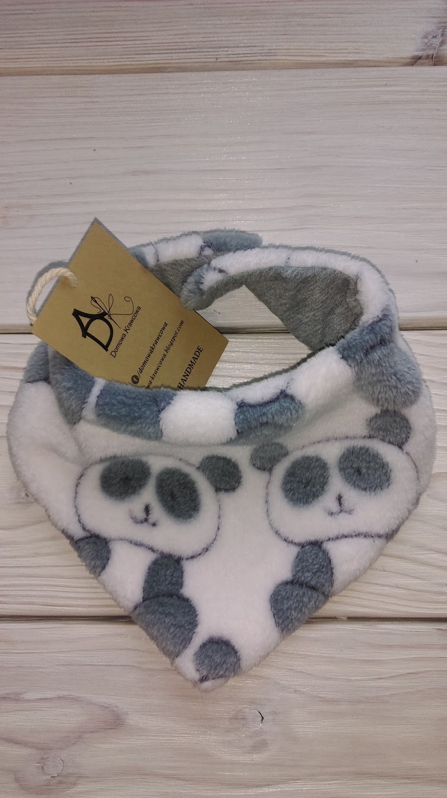 Znalazłam w szafie tkaninę plusz “pandy” i uszyłam komplet czapkę, komin i ponieważ został mi jeszcze kawałek zrobiłam wykrój i powstała chustka pod szyję.